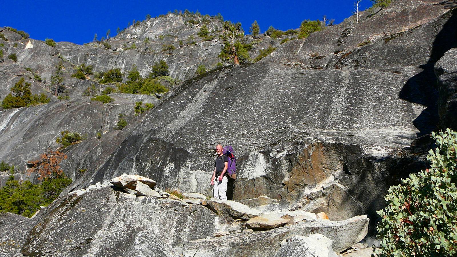 Am dritten Tag steigen wir auf gut ausgebautem Weg in den Grand Canyon of the Tuolumne River ab. Im schönen bewaldeten Pate Valley mit seinen Herbstfarben treffen wir zum ersten Mal auf einen Schwarzbären, der panisch die Flucht ergreift. Wer hat sich mehr erschrocken, der Bär oder wir? Nun geht es immer weiter in die enger werdende Schlucht hinein. Nach dem wir die Engstelle der Muir Gorge über einen Bergsporn umgangen haben, kommen wir wieder in den Talgrund. Am sandigen Flussufer finden wir einen schönen Zeltplatz für die Nacht.